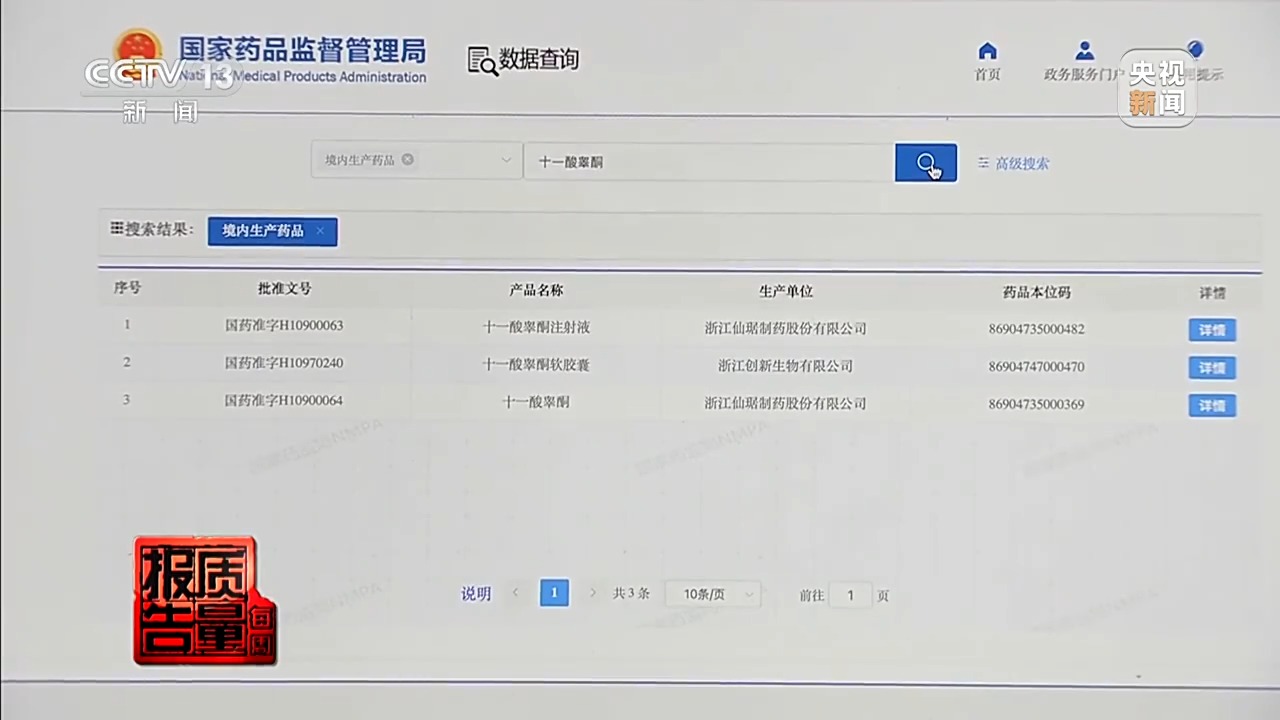 苏州市检察公益诉讼食品药品检测实验室顾问 温尧林:这三个产品,我们从中检测到了宝丹酮十一烯酸酯、环戊丙酸睾丸酮和去氢甲睾酮,这个结果和包装上的英文标识是一致的。它们都属于合成代谢类固醇,但是它们在我国都没有获得国家药监局的批准,在我国是没有合法身份的。